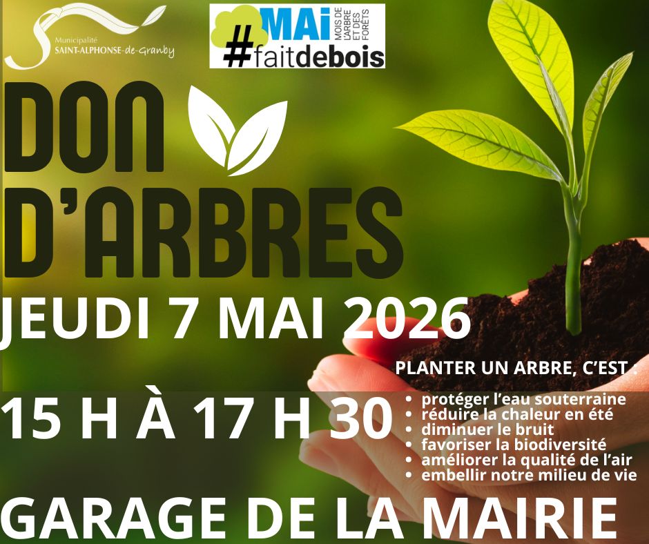La distribution aura lieu le mercredi 7 mai 2026 de 15 h à 17h30 au garage de la mairie (stationnement de la clinique et pharmacie). Une limite de 2 arbres par citoyen, apportez vos sacs/ pots pour récupérer vos semis. Vous devez avoir en votre possession une preuve de résidence ou la carte loisirs de la Municipalité.